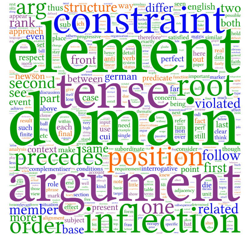 Turning to the case of German, we find a similar situation to English, but with two important differences. While the English root wants to be second in the argument domain and second to last in the inflection domain, the German root wants to be last in the argument domain and first in the inflection domain. Thus, for German the ordering constraints outrank the anti-ordering constraints: