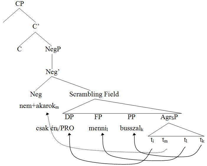The way it relates to the derivation of constructions involving infinitival clauses with nominative subjects is the following: the subject of the infinitive is a PRO, as expected, but at the same time an only-DP, which moves to the [Spec, FP] position of the infinitival CP. This is what makes such constructions problematic: there are different ways to express Focus in Hungarian (movement to a designated Focus position or stress assignment), but neither of them is applicable to an unpronounced constituent.